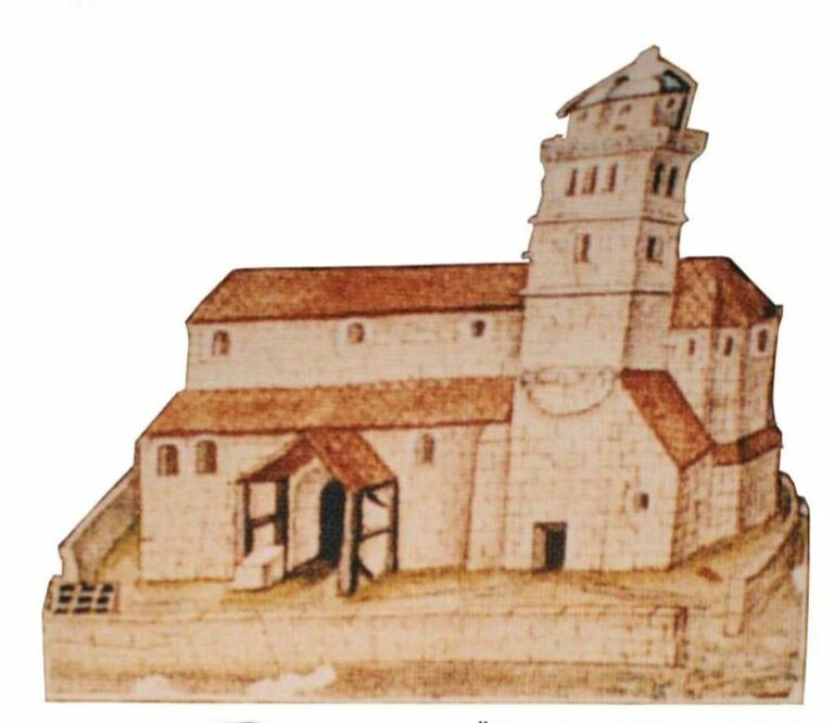 Die repräsentative Neugestaltung des Kirchenbaus findet ihren ersten Abschluss als dreischiffige gotische Basilika zu Beginn des 15. Jahrhunderts. Diese Bauform hat St. Laurentius [weitere Infos zur Kirch-Weihe und zum Namenspatron Laurentius finden sich hier] auch noch auf ihrer ältesten Darstellung aus dem Jahr 1575.